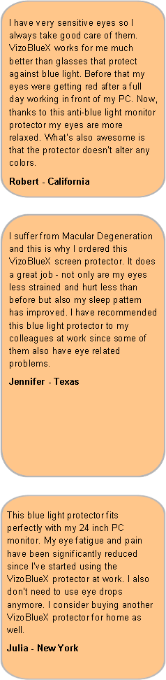 The VizoBlueX anti-blue light monitor/TV screen protector has several coatings’ layers. Each of these layers has its special function such as blue light reduction, anti-flicker, scratch and crack resistance. The VizoBlueX anti-blue light monitor/TV screen protector stops the harmful range of the blue light and lets only the non-harmful blue light and colored light get to your eyes. In this way, your eyes are well protected and are kept fresh throughout the day. Also, you will enjoy a higher quality sleep during the night. Moreover, VizoBlueX maintains the crystal clear picture of your TV screen as it doesn’t distort or change any colors of the TV picture. The VizoBlueX anti-blue light monitor/TV screen protector has been developed for people who spend hours playing games or watching TV and those who work on their computers.